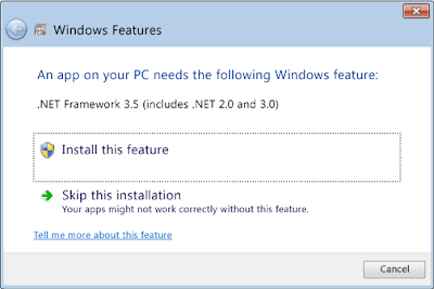 Cara Mengatasi Error .NET Framework 3.5 Windows 8 - Bila Anda menginstall windows 8 beserta program-program aplikasi, kemungkinan besar Anda akan menjumpai masalah program aplikasi yang mengharuskan .NET Framework 3.5 terinstall di windows 8 Anda. Walaupun di windows 8 sendiri sudah ada .NET Framework versi 4.5, tapi ternyata masih ada program aplikasi yang masih membutuhkan .NET Framework 3.5. Lucunya, walaupun Anda memiliki master software .NET Framework 3.5 yang ukurannya lebih dari 200 MB dan Anda ingin memasangkannya dikomputer, ternyata akan muncul juga pesan peringatan yang sama yaitu An app on your PC needs the following Windows feature.